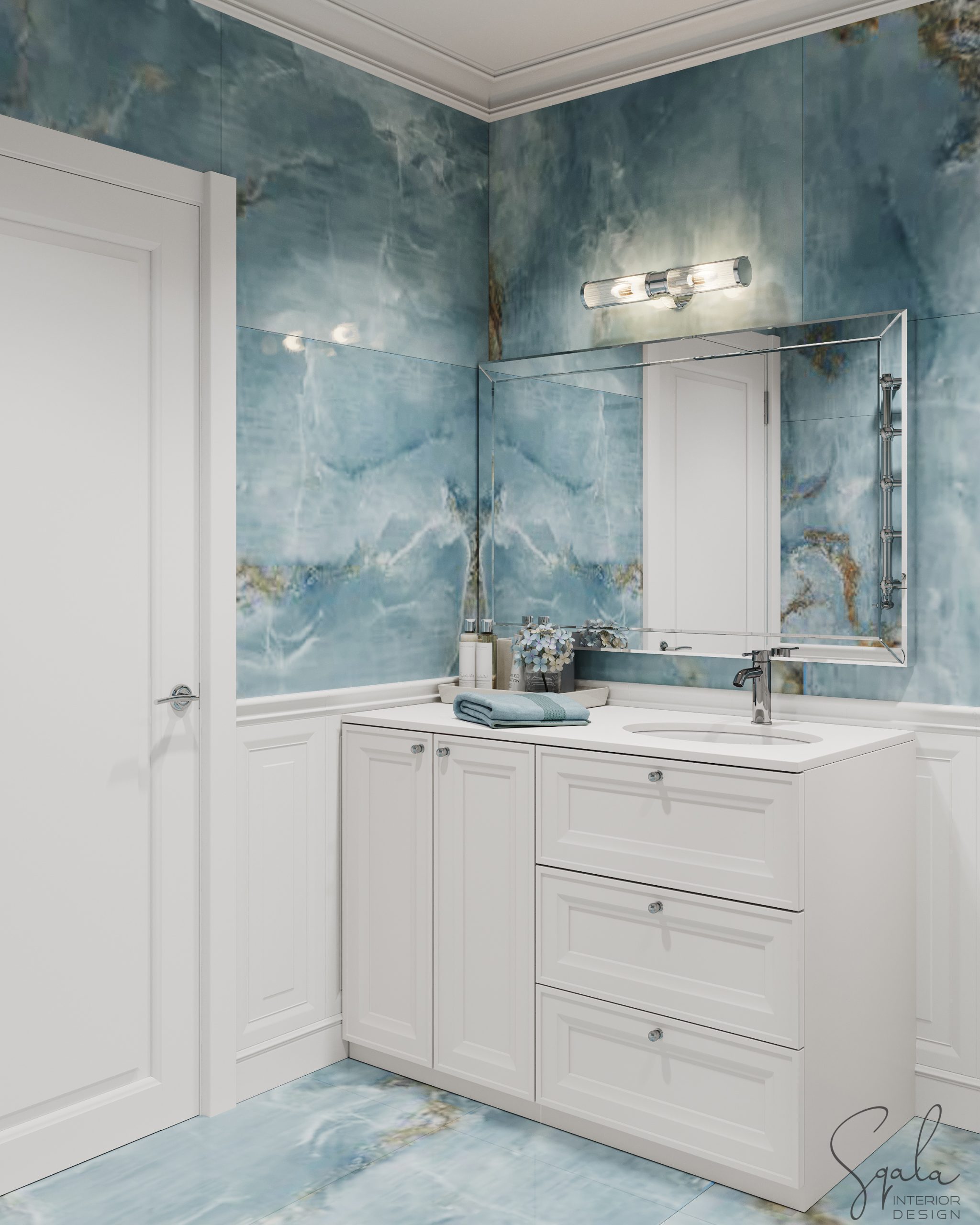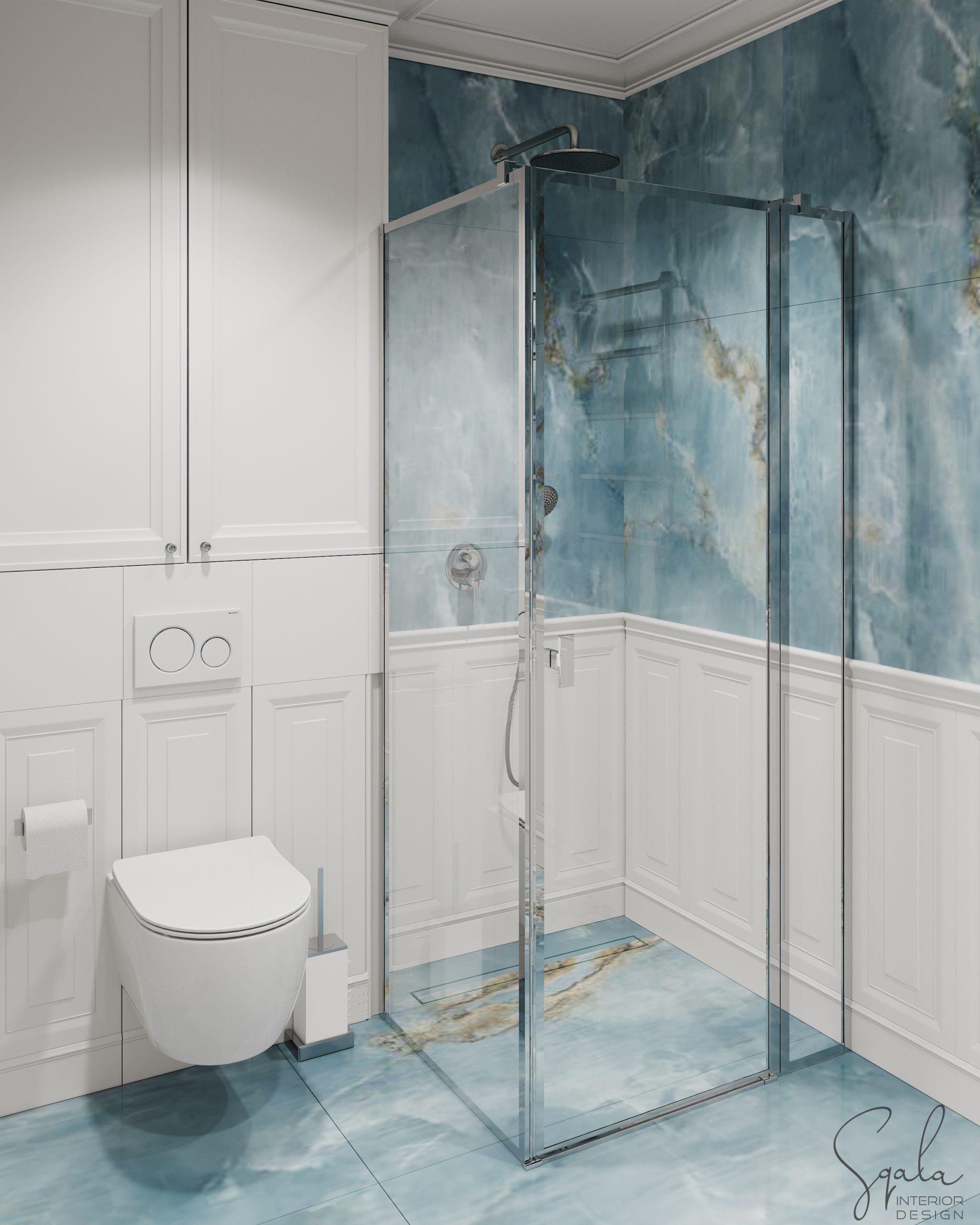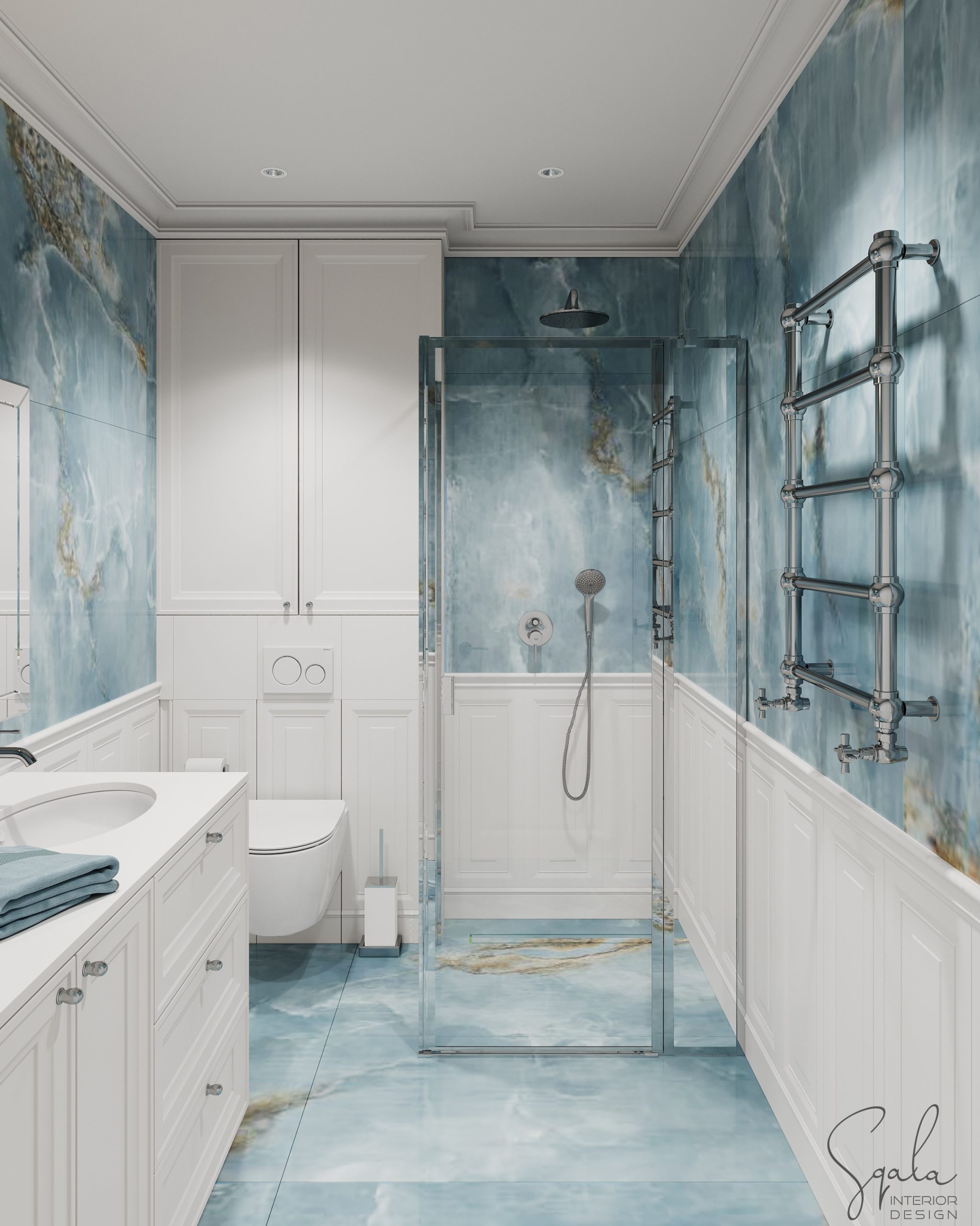 Łazienka w nadmorskim apartamencie na wynajem z błękitnymi i białymi płytkami oraz klasyczną zabudową meblową