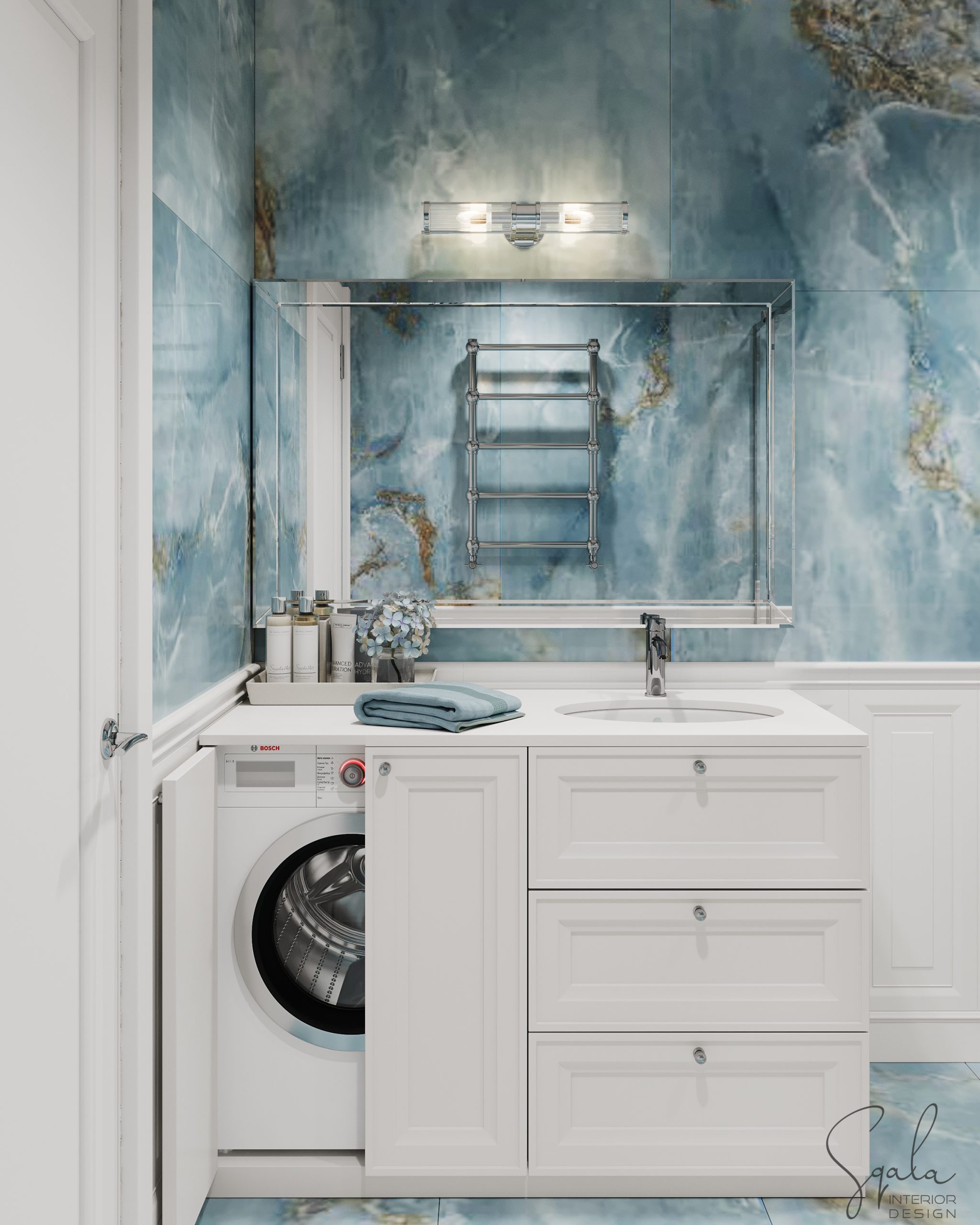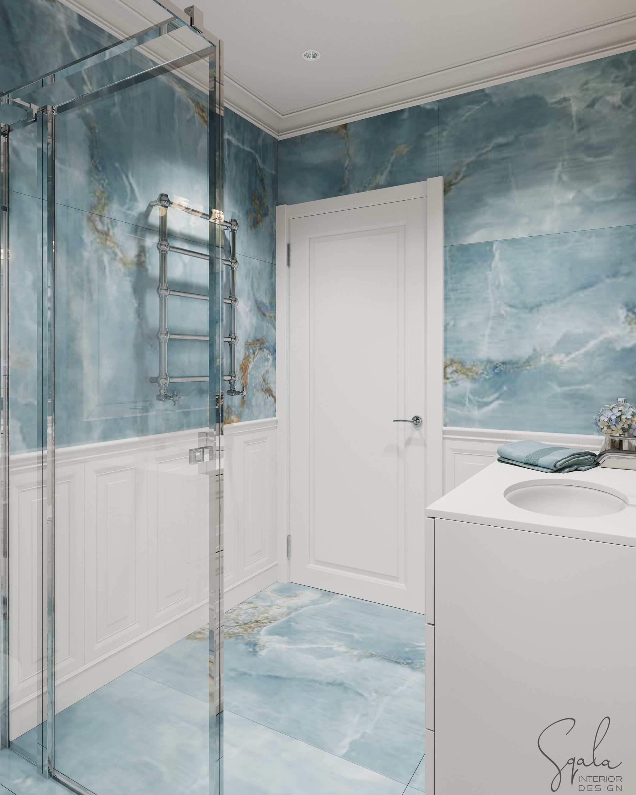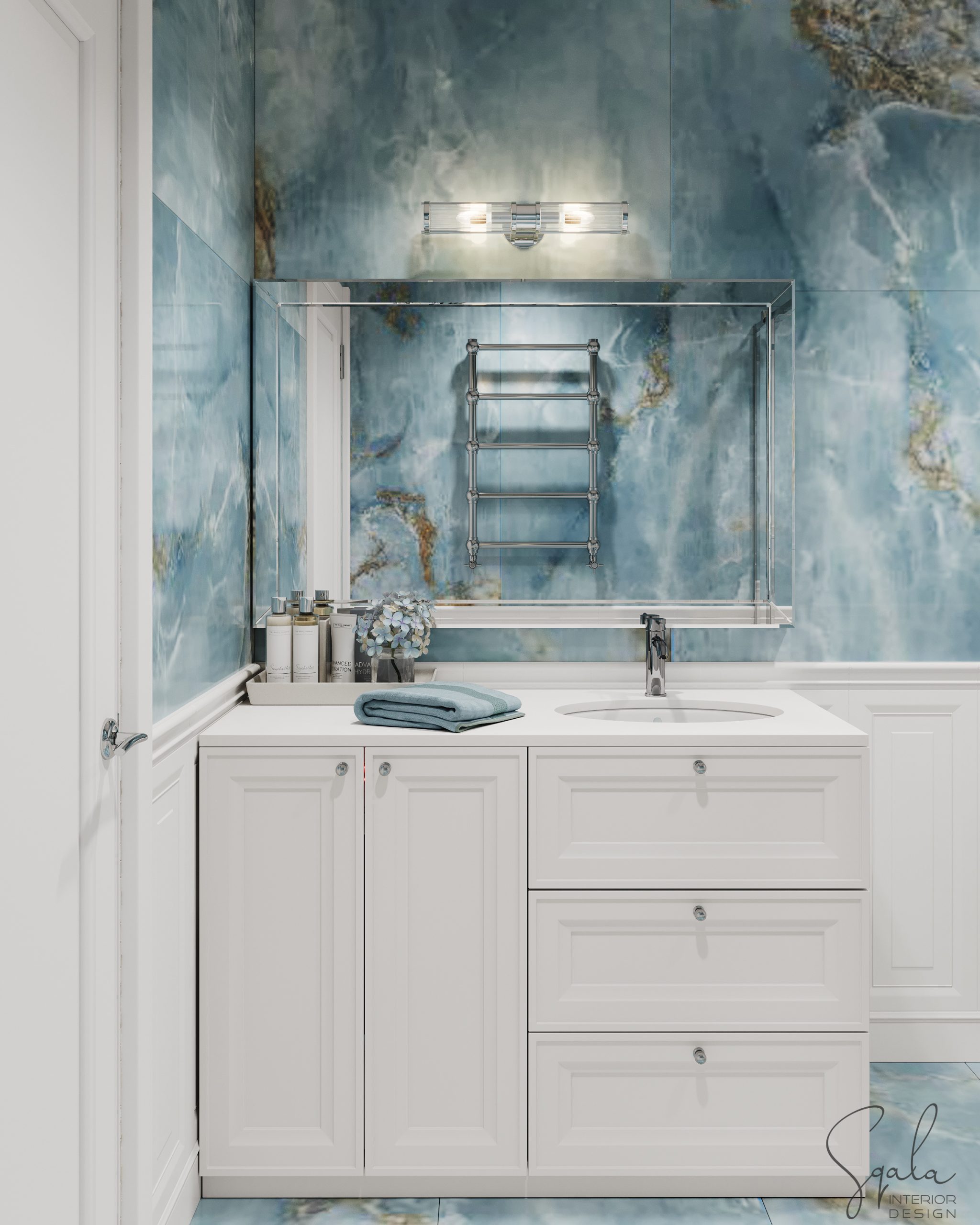 Łazienka w nadmorskim apartamencie na wynajem z błękitnymi i białymi płytkami oraz klasyczną zabudową meblową