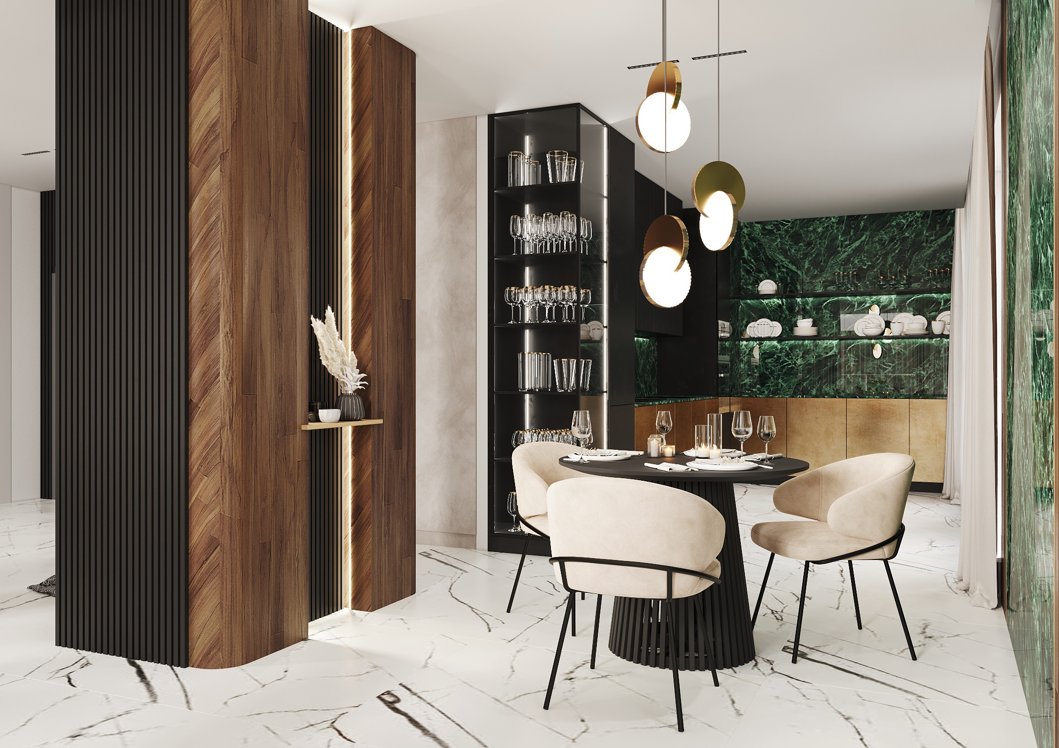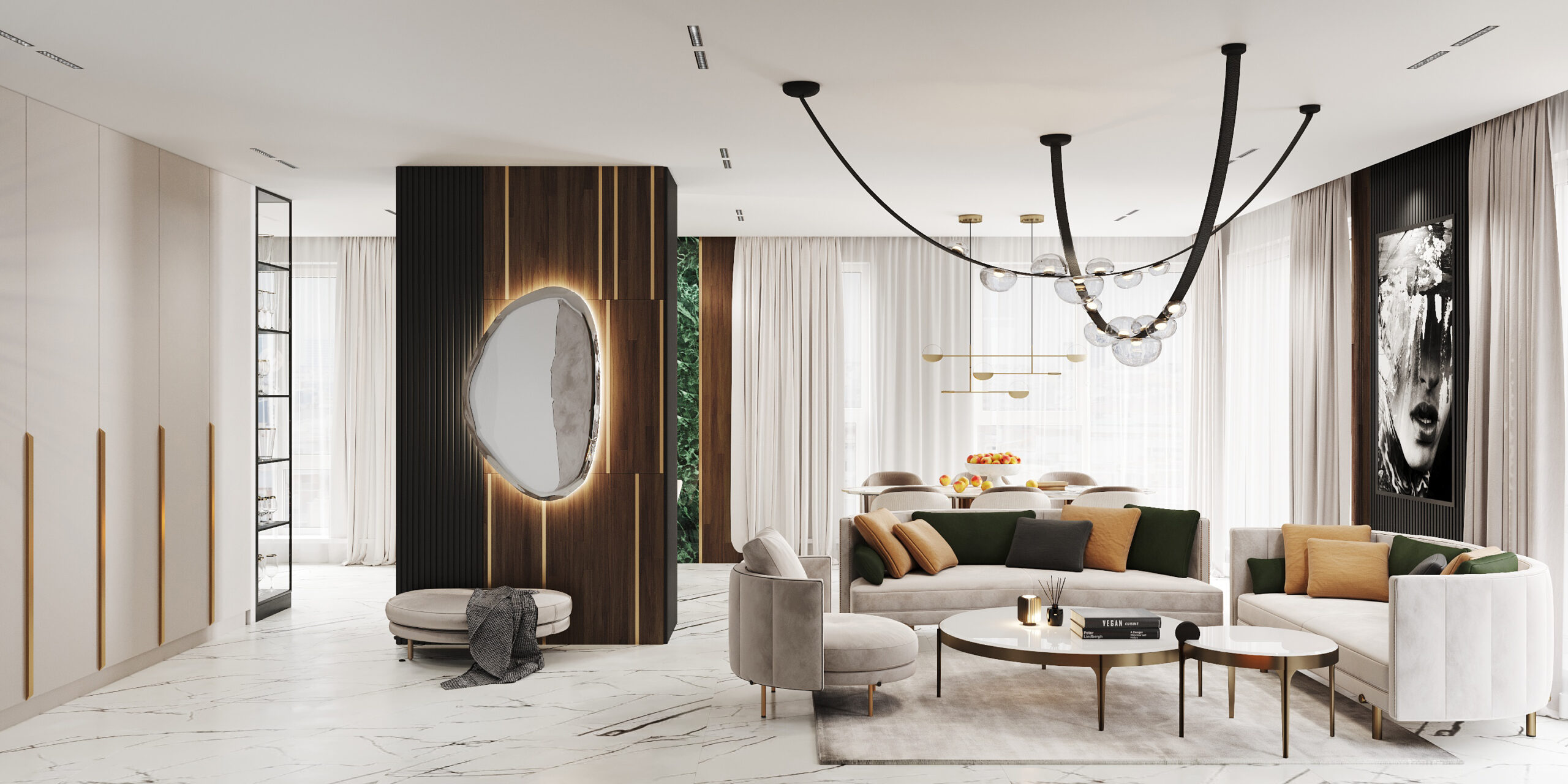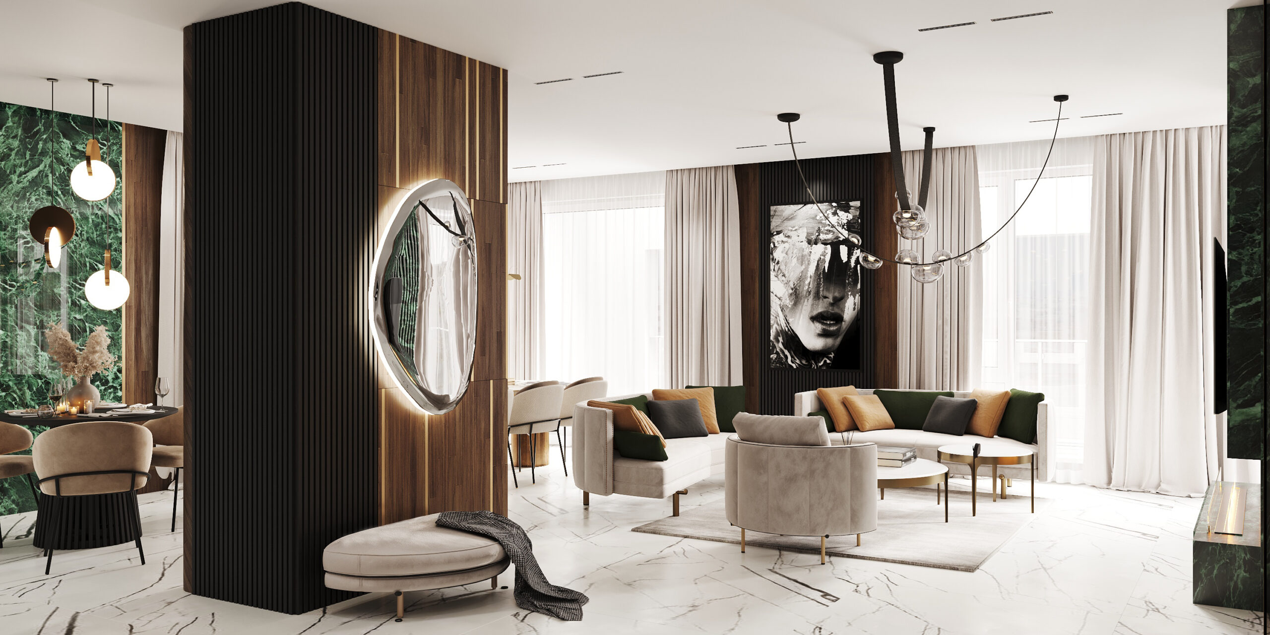 Nowoczesny apartament na warszawskim Mokotowie z przestronnym salonem i tarasami, w którym uwagę przykuwają designerskie lampy i dodatki.