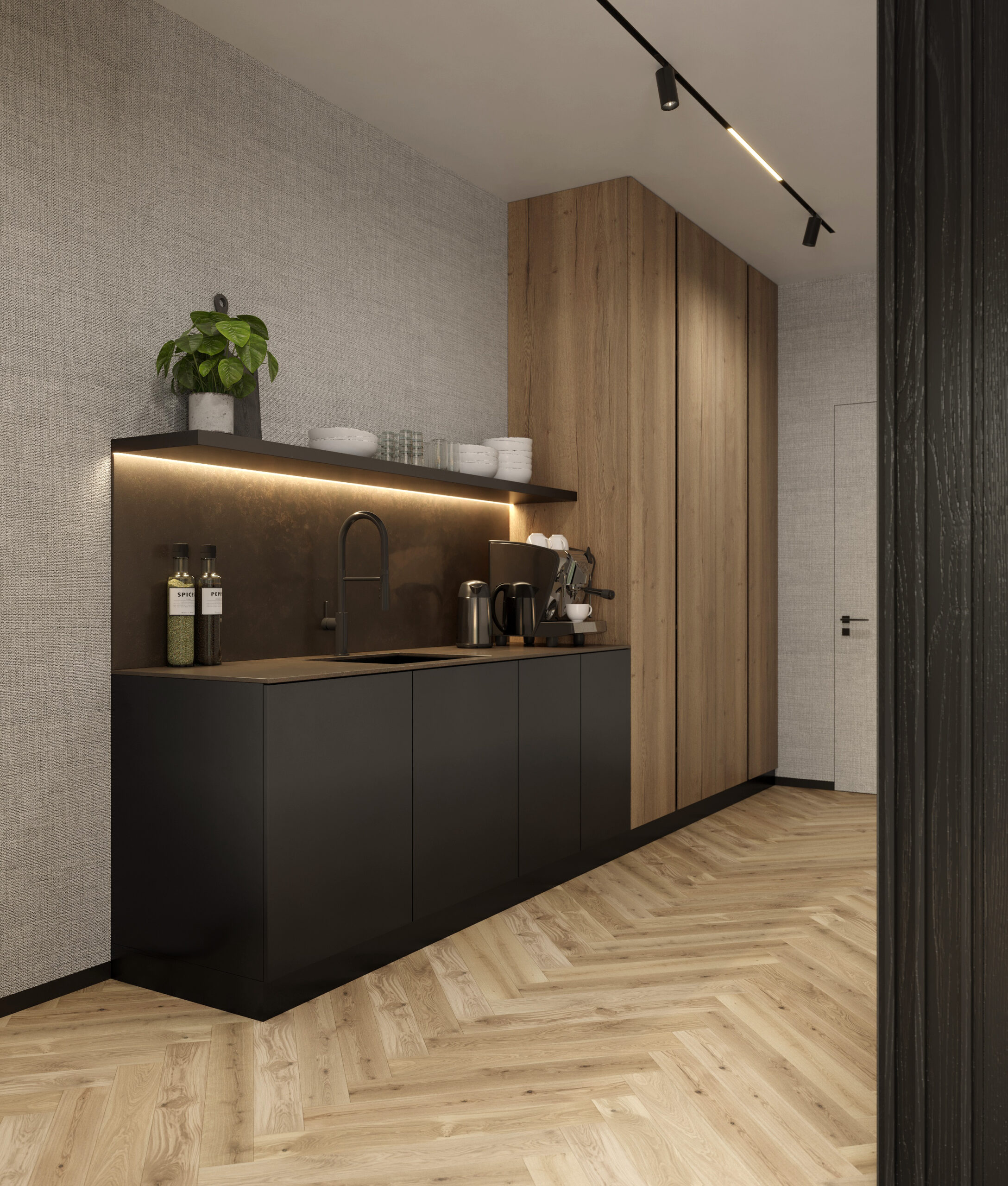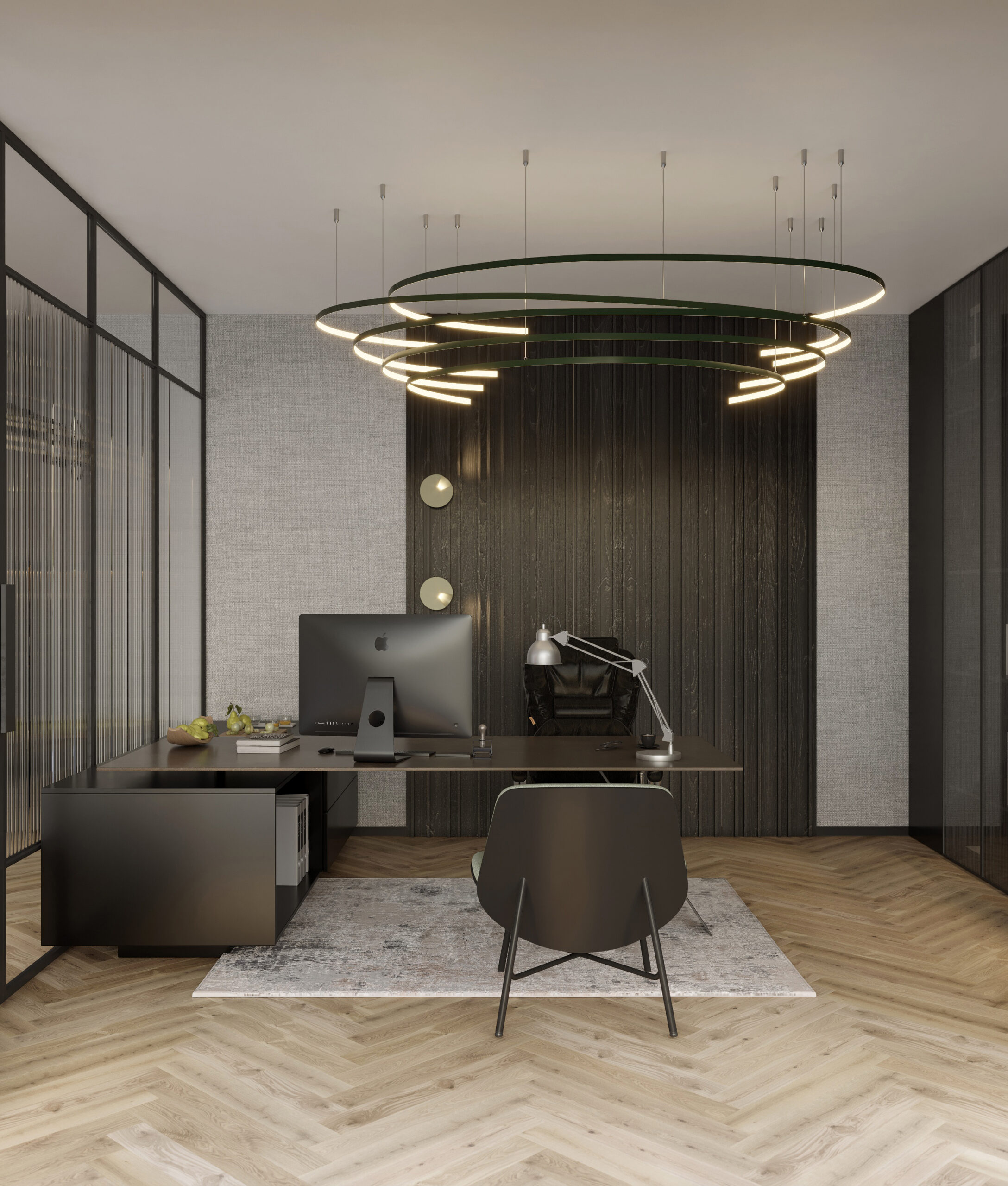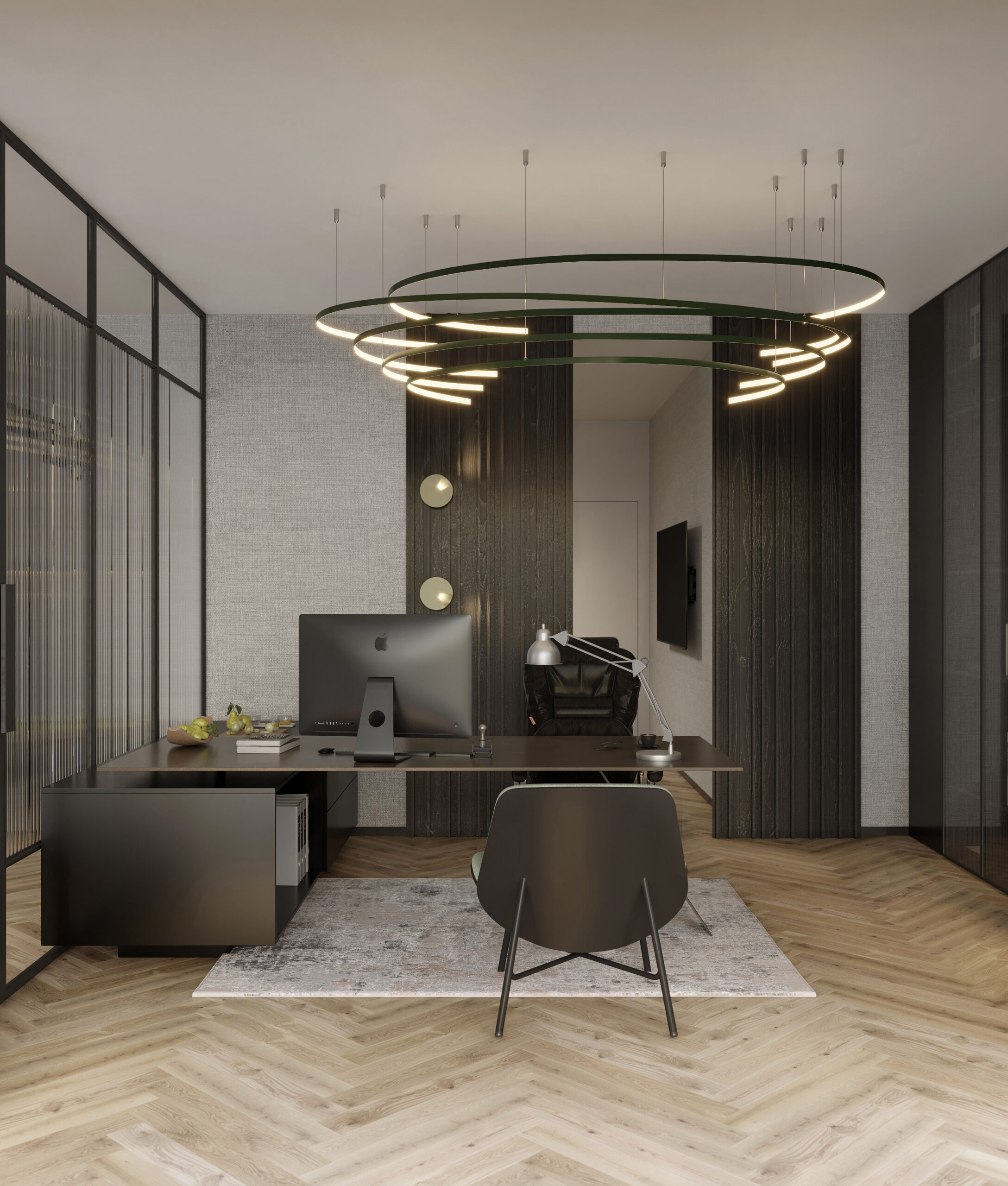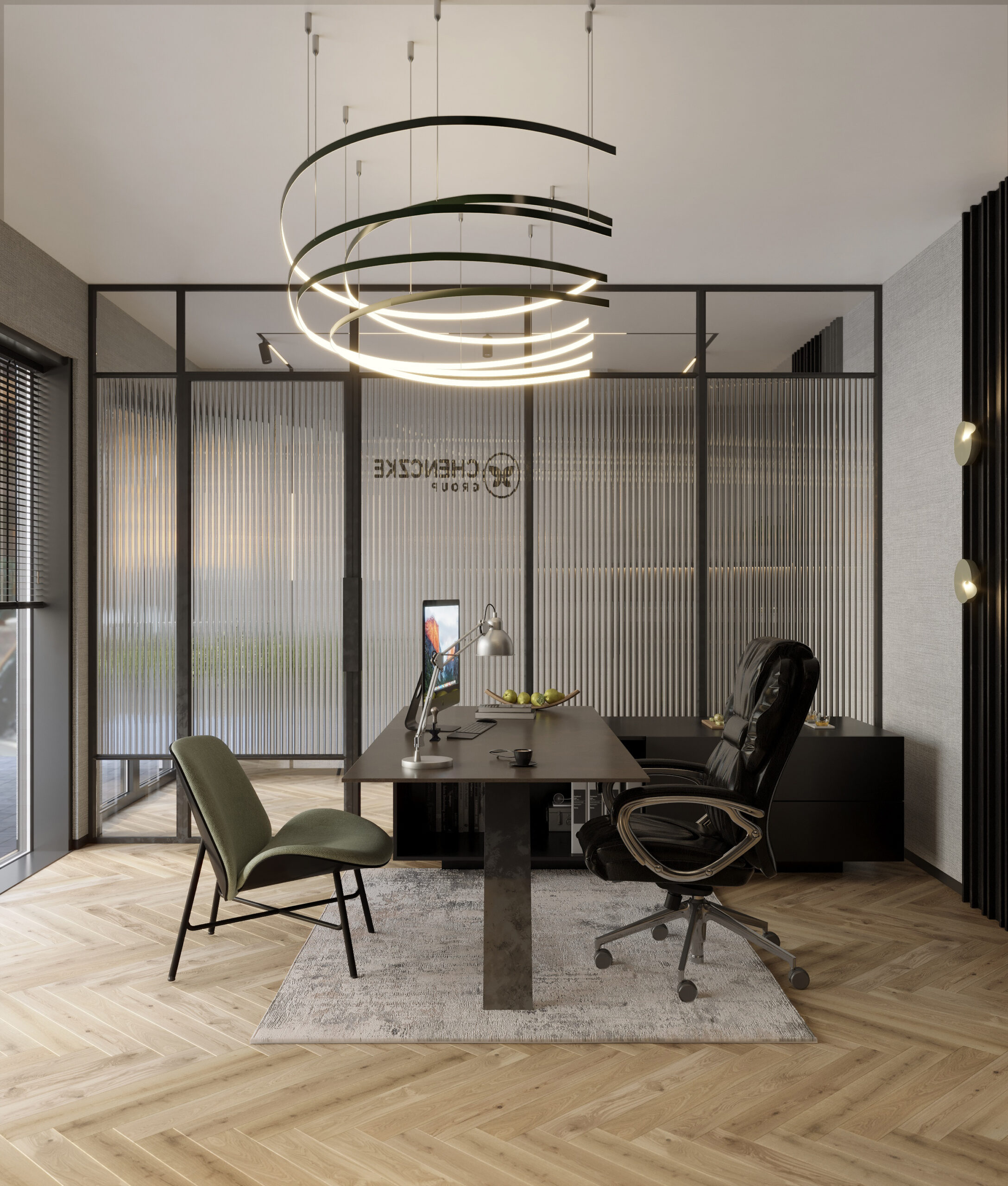 Projekt biura z branży ogrodniczej w ciemnej kolorystyce z dodatkami w odcieniach zieleni , które nawiązują do profilu działalności firmy.
