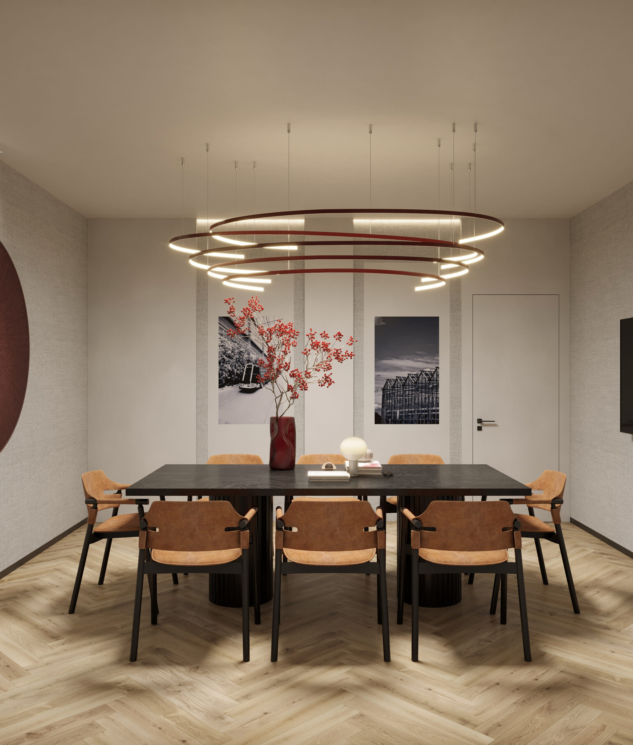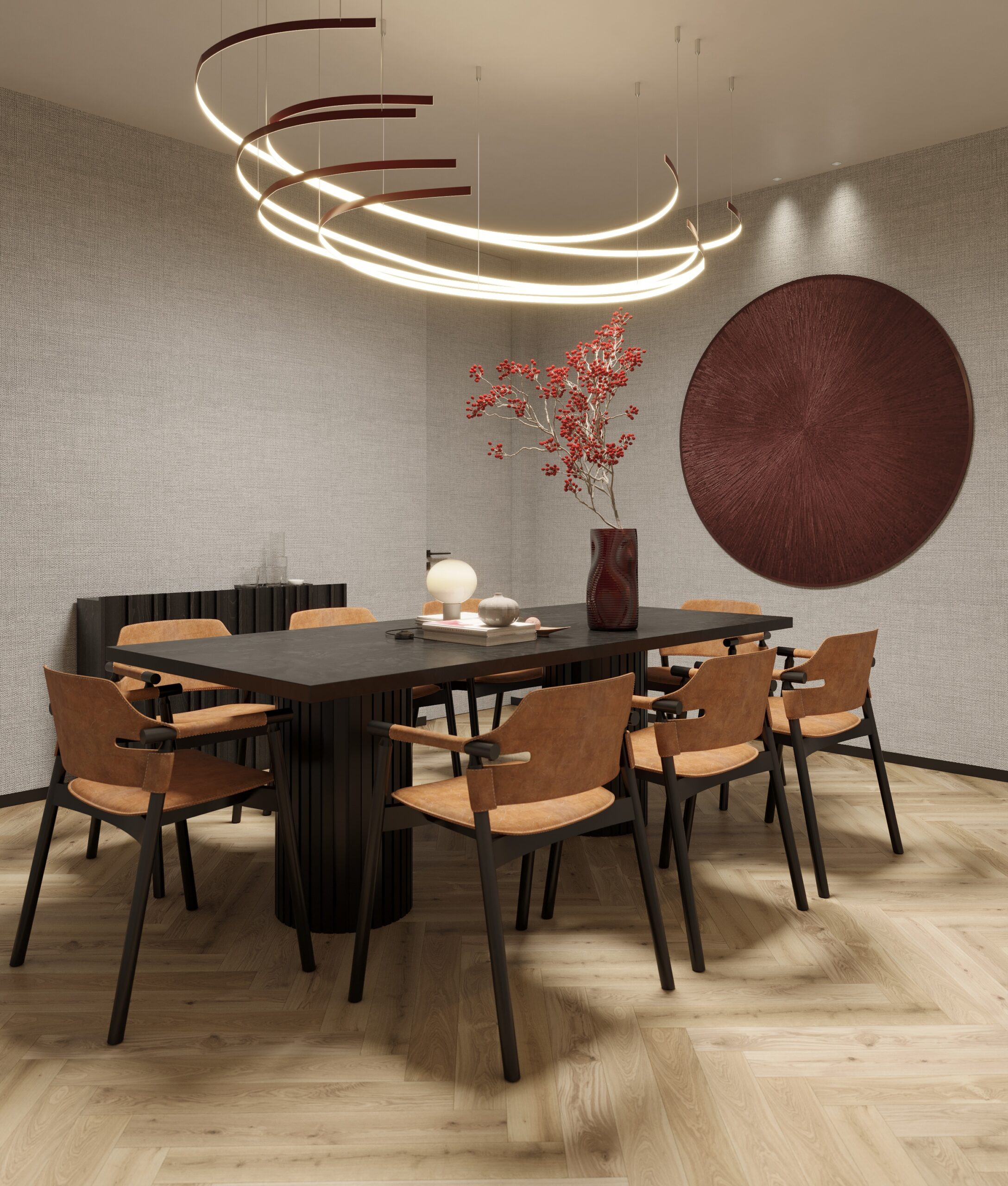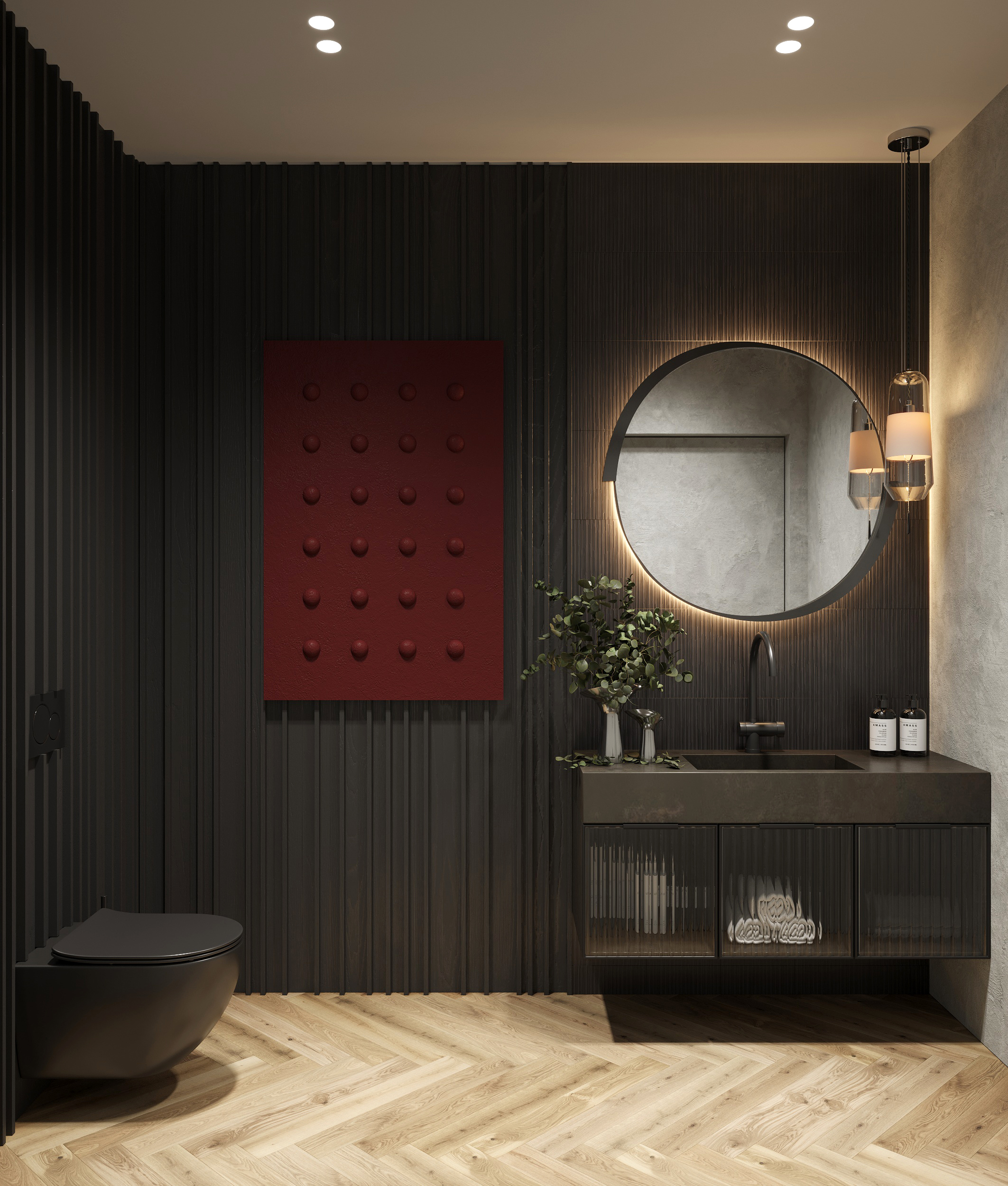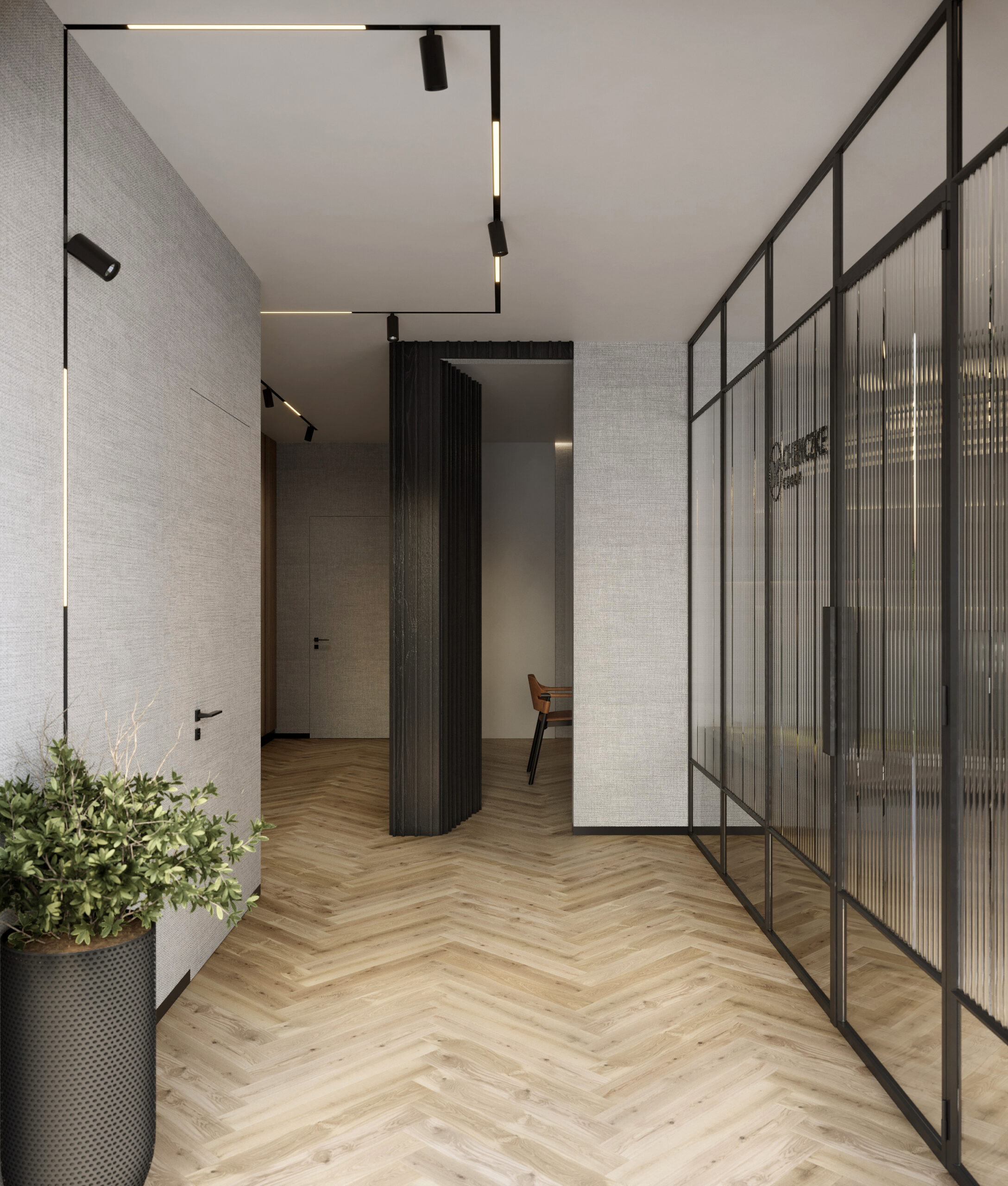 Projekt biura z branży ogrodniczej w ciemnej kolorystyce z dodatkami w odcieniach zieleni , które nawiązują do profilu działalności firmy.