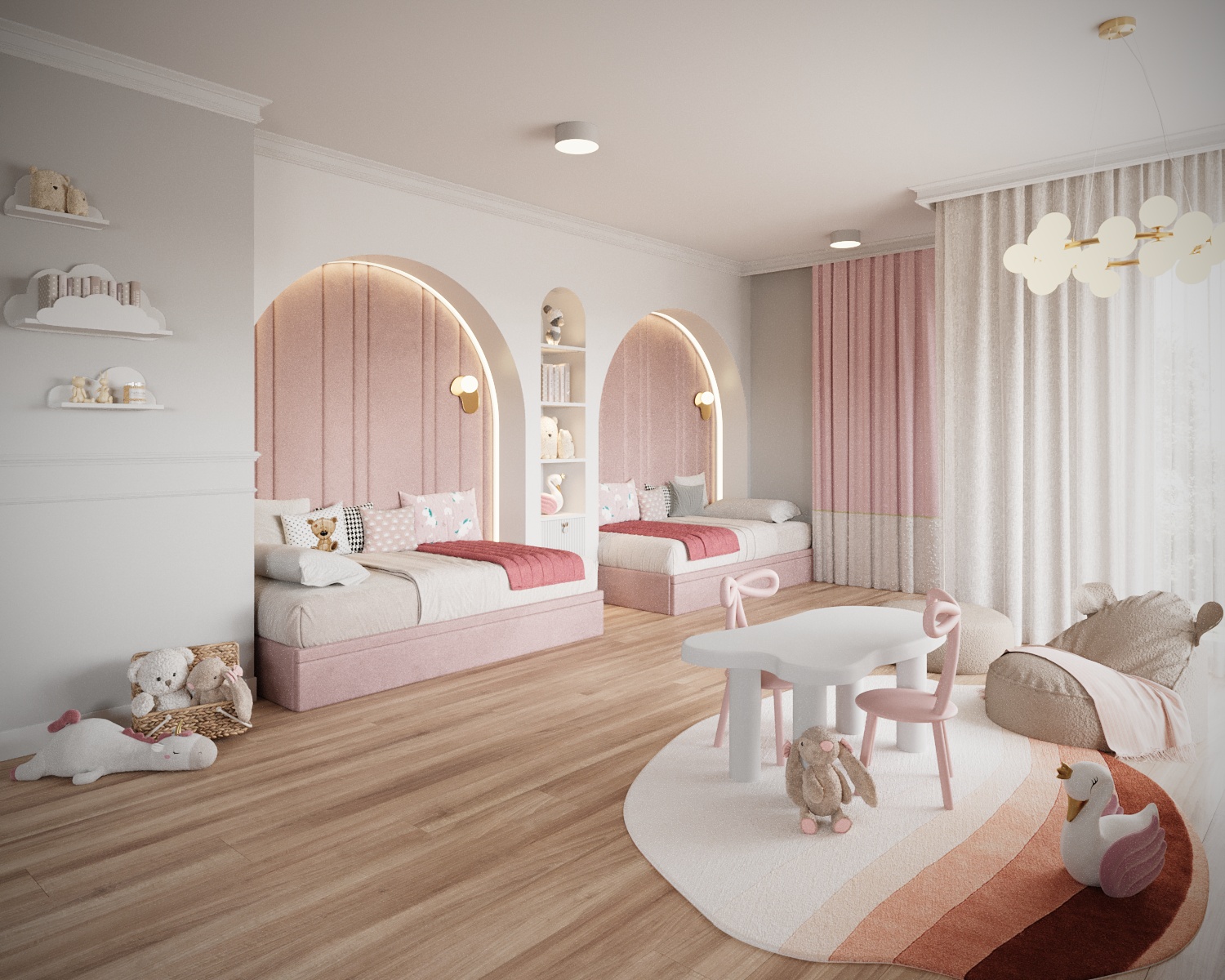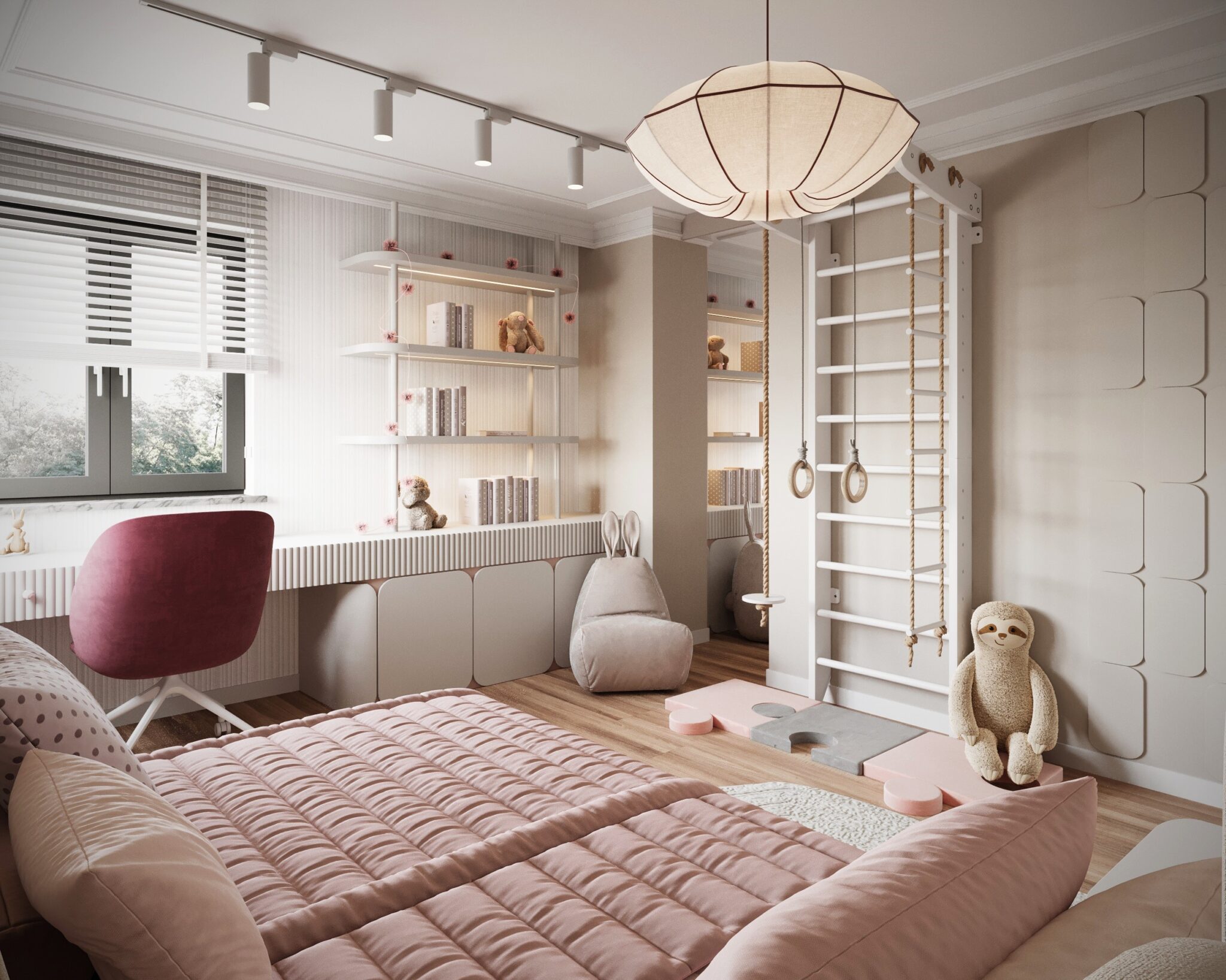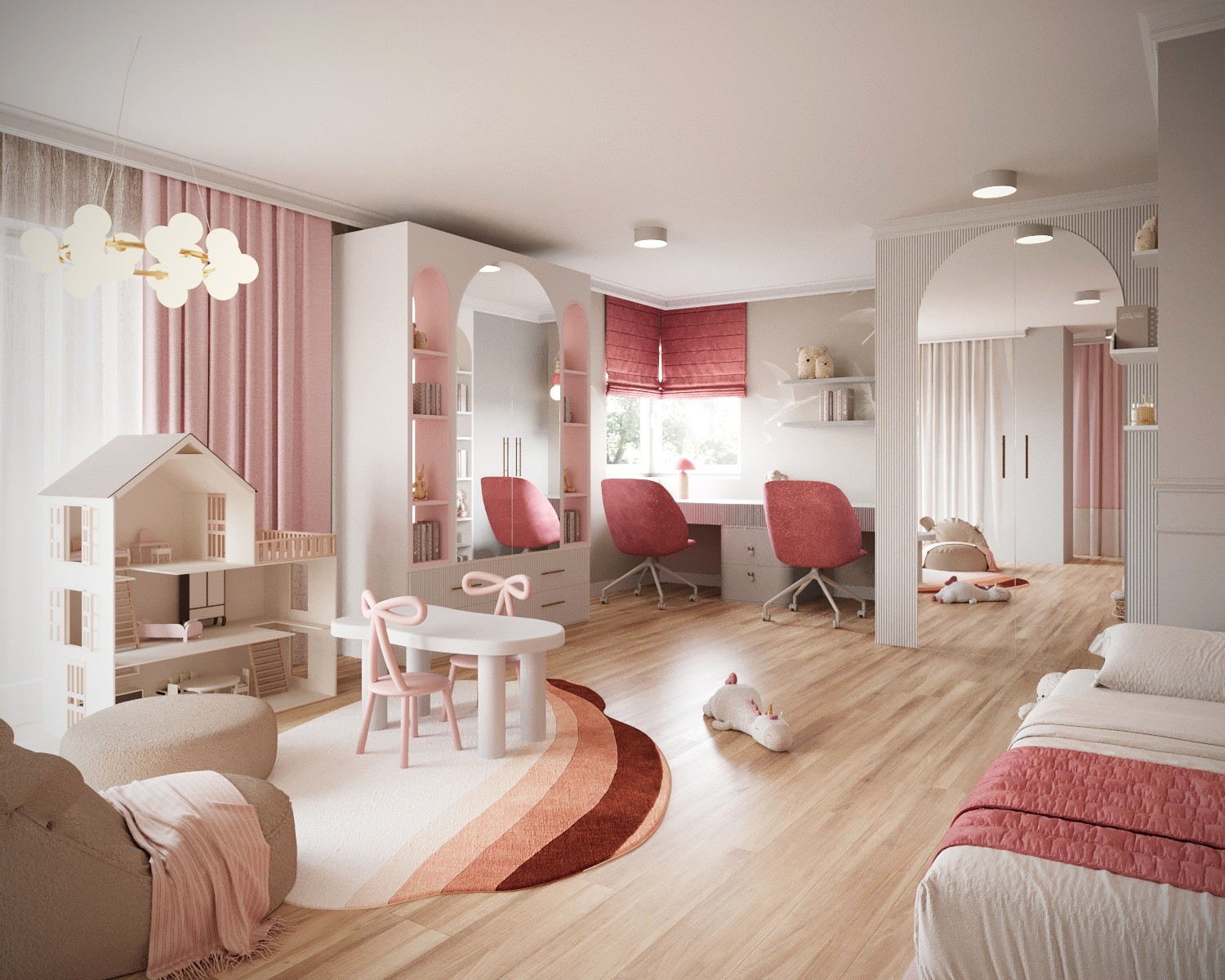 Projekty pokoi 3 dziewczynek w wieku przedszkolnym. Pokój Helenki w odcieniach beżu łączy ciepło neutralnych tonów z urokiem pastelowych akcentów. Pokój bliźniaczek to przestrzeń wypełniona ciepłymi odcieniami różu i beżu, z kącikiem do kreatywnych zabaw, a także miejscem do nauki.