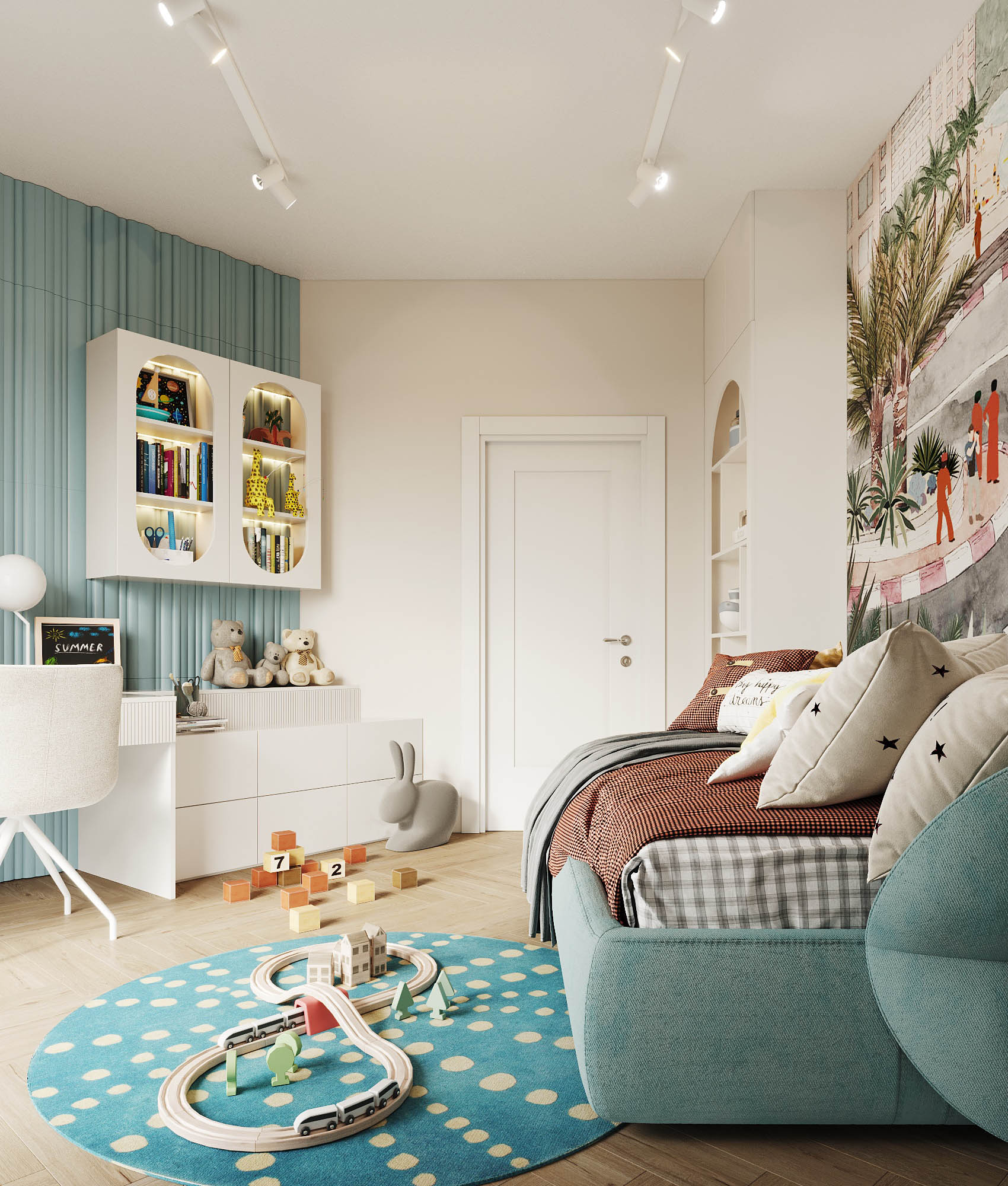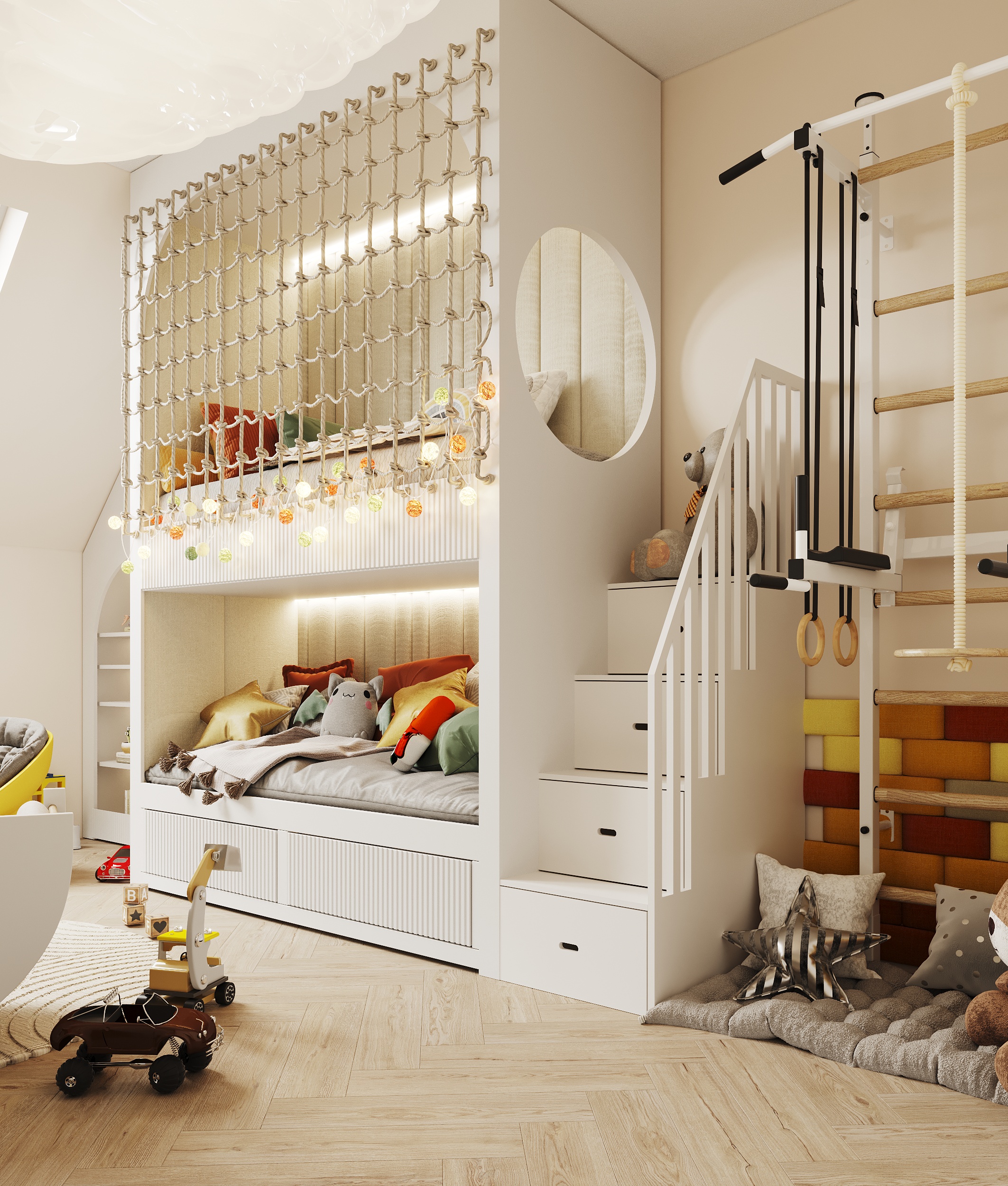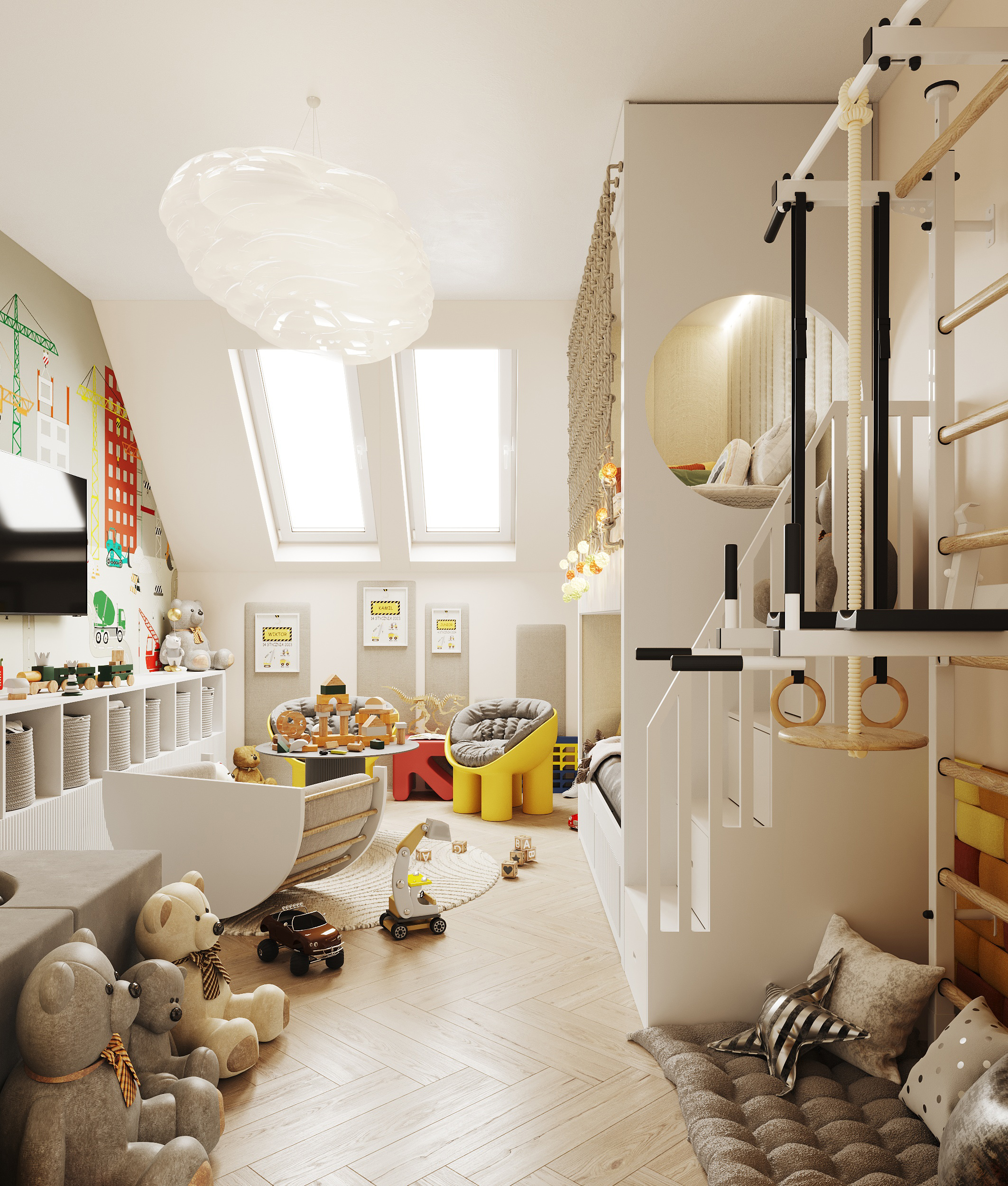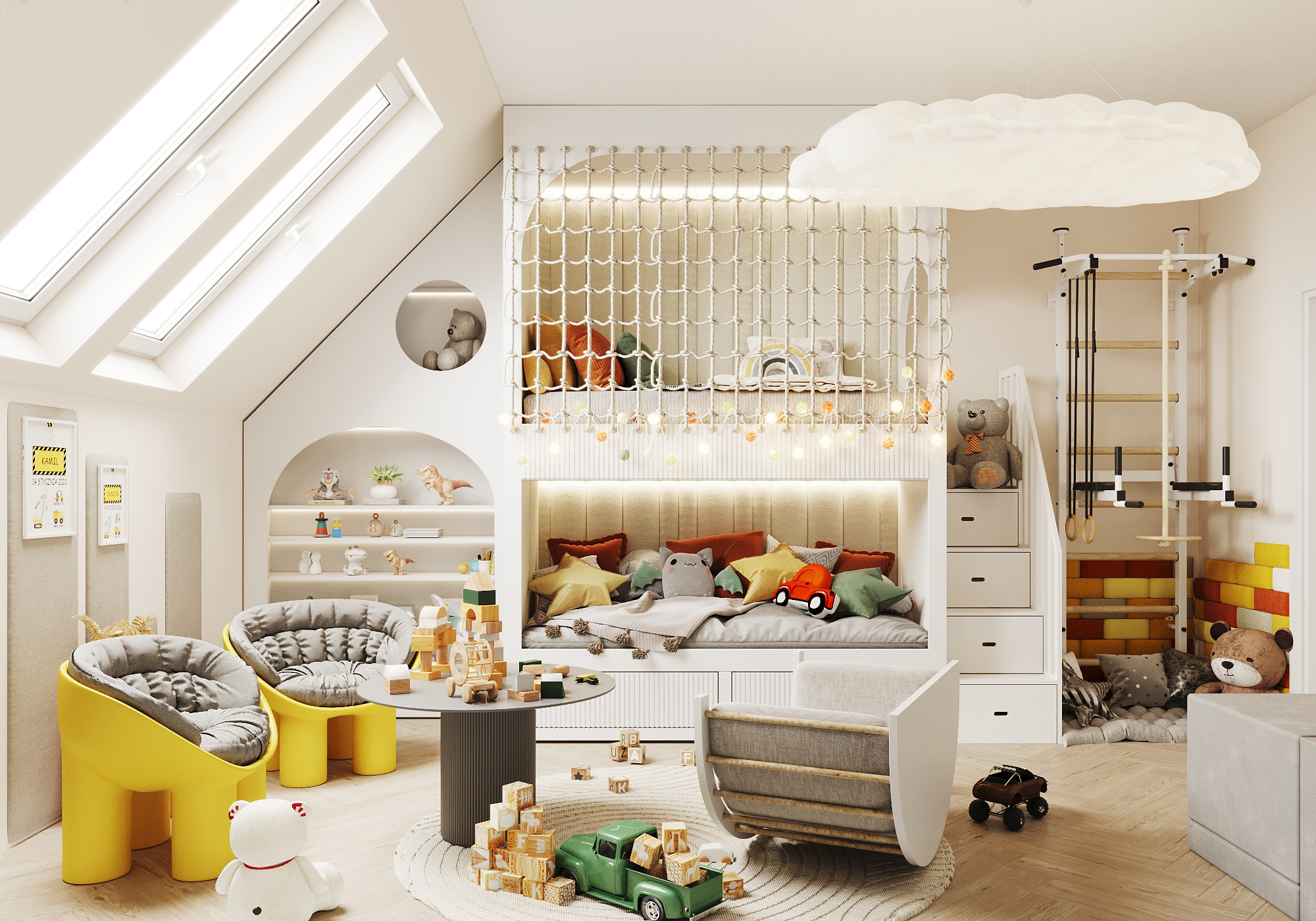 Część mieszkalna, w której narożna kaszmirowa kuchnia połączona jest z jadalnią i salonem. Strefa dziecięca to pokój chłopca i bawialnia z piętrowym łóżkiem