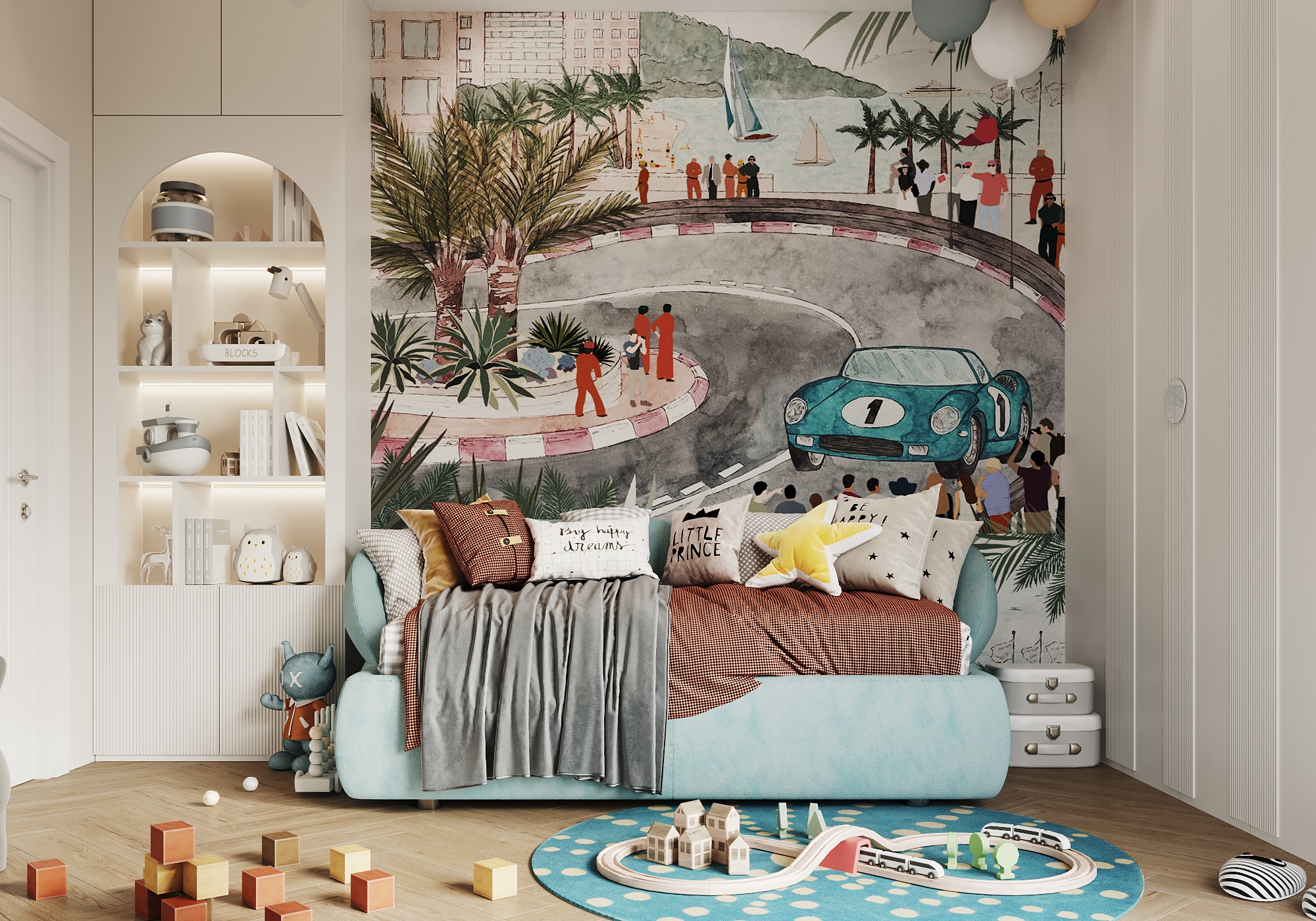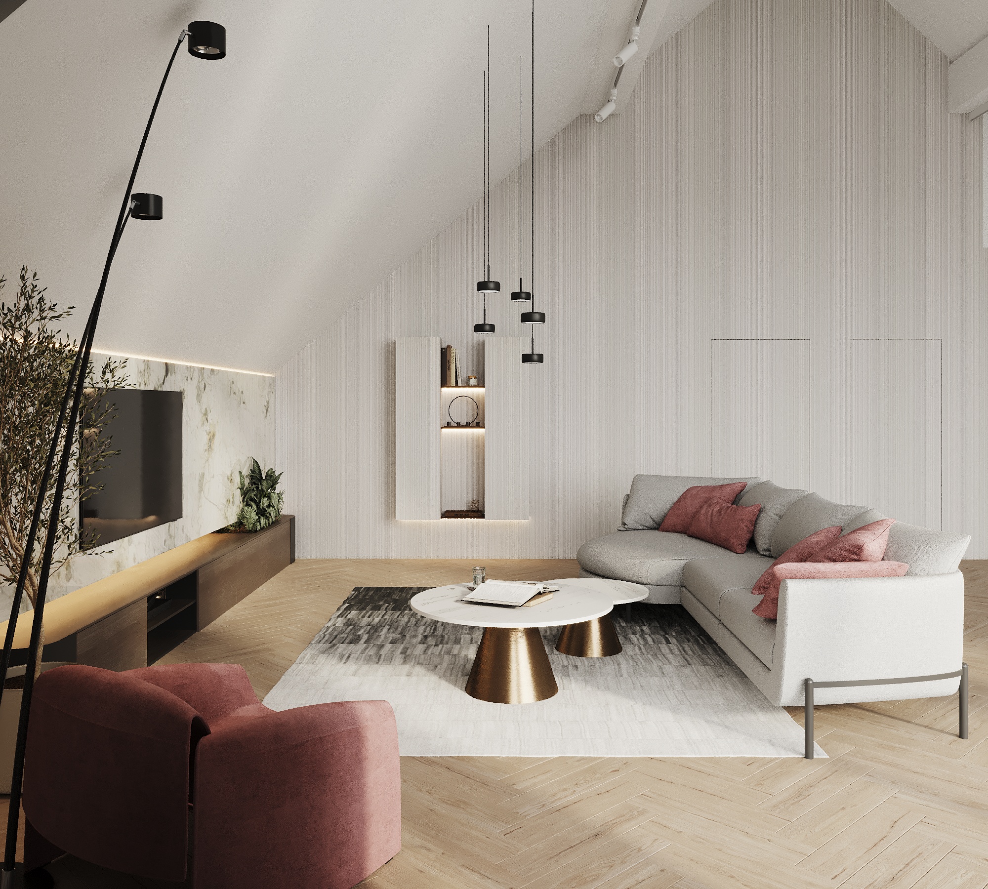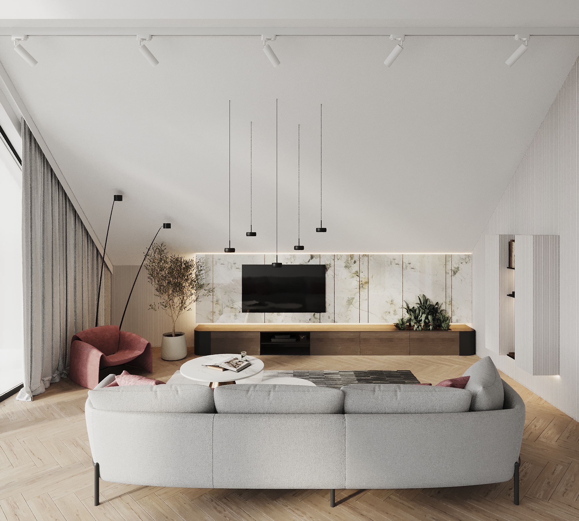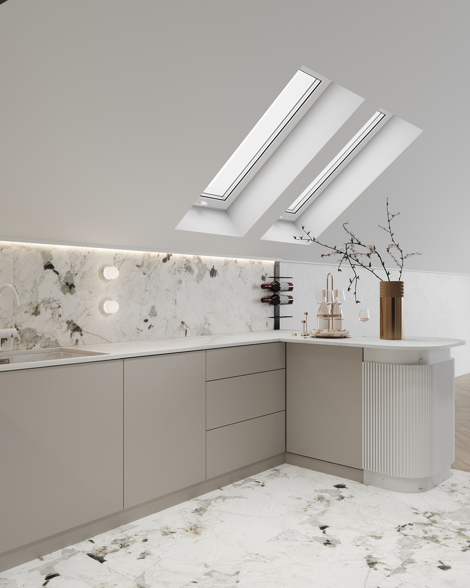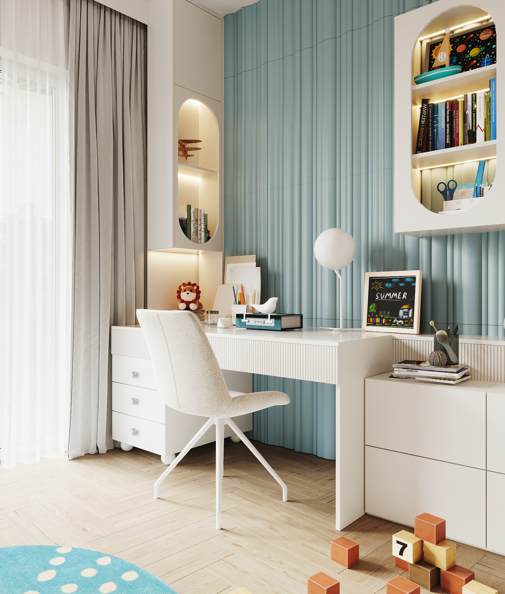 Część mieszkalna, w której narożna kaszmirowa kuchnia połączona jest z jadalnią i salonem. Strefa dziecięca to pokój chłopca i bawialnia z piętrowym łóżkiem