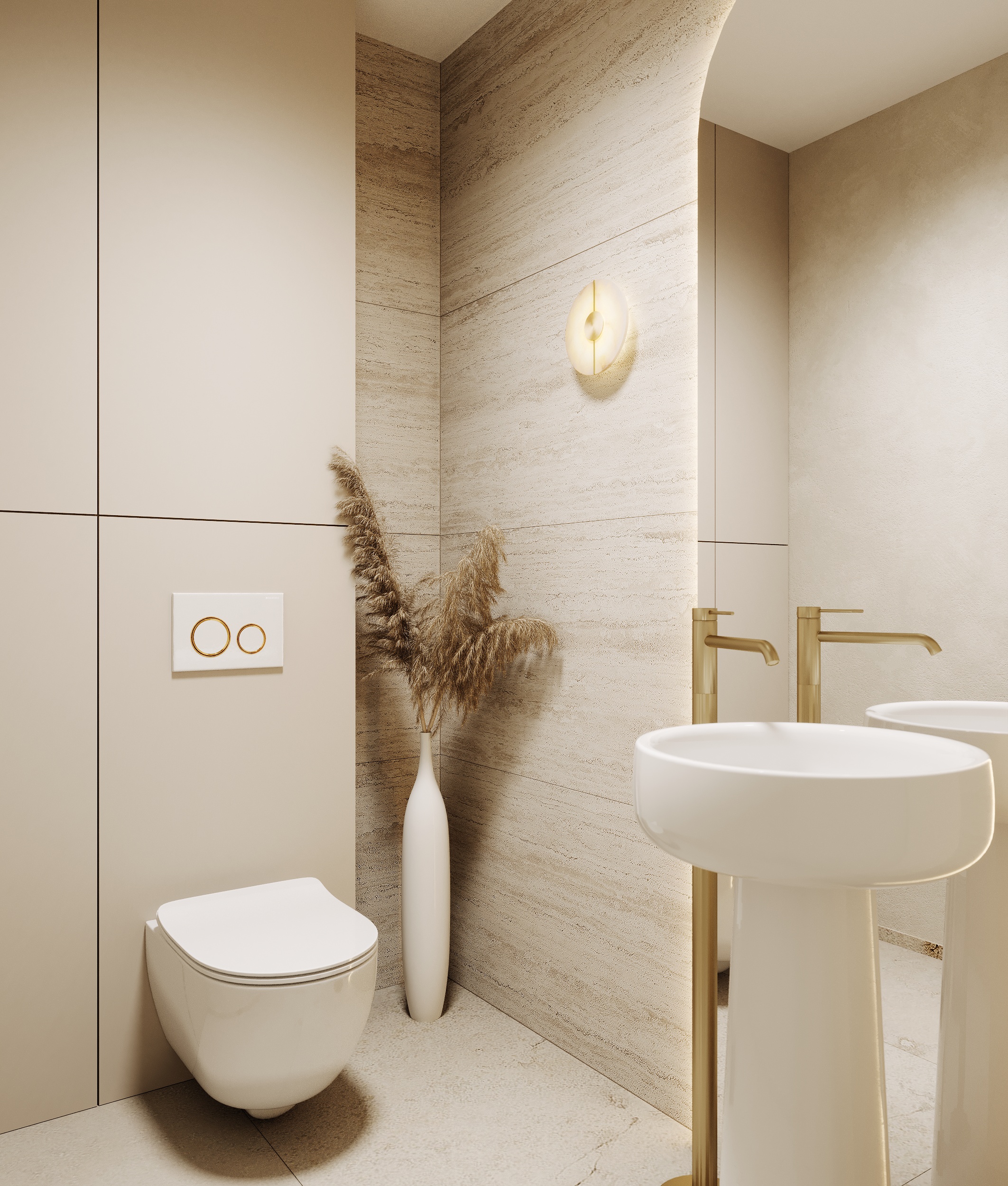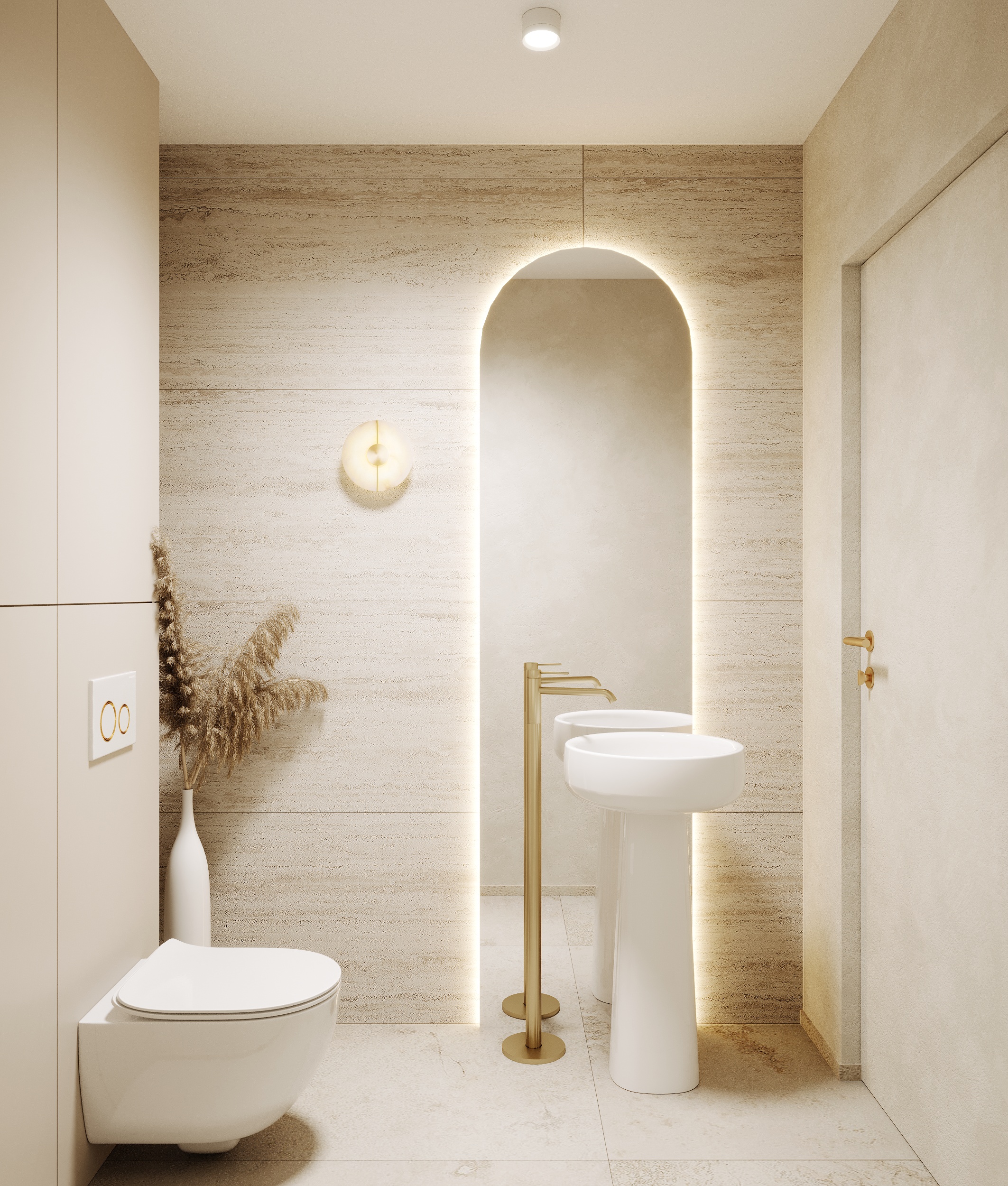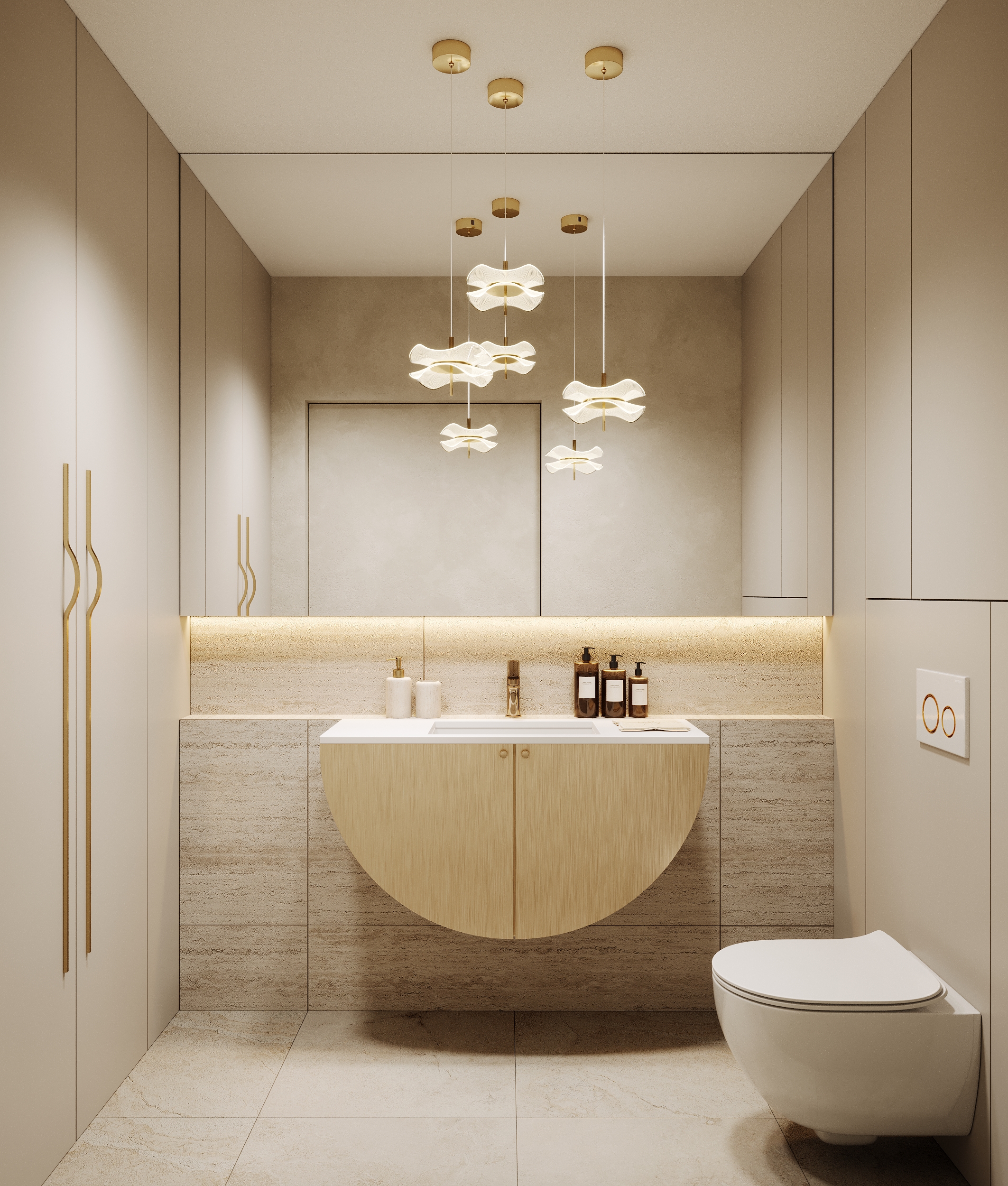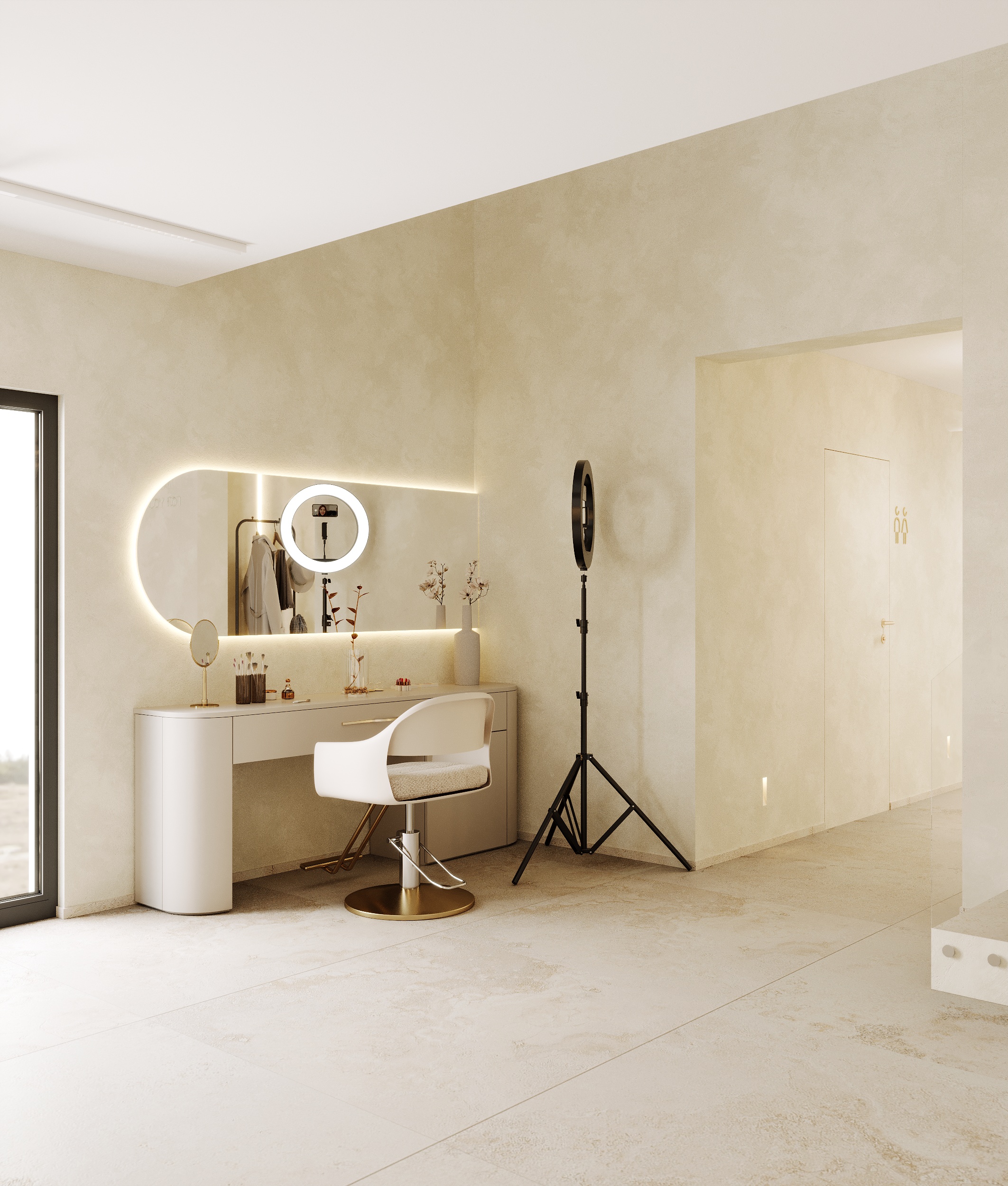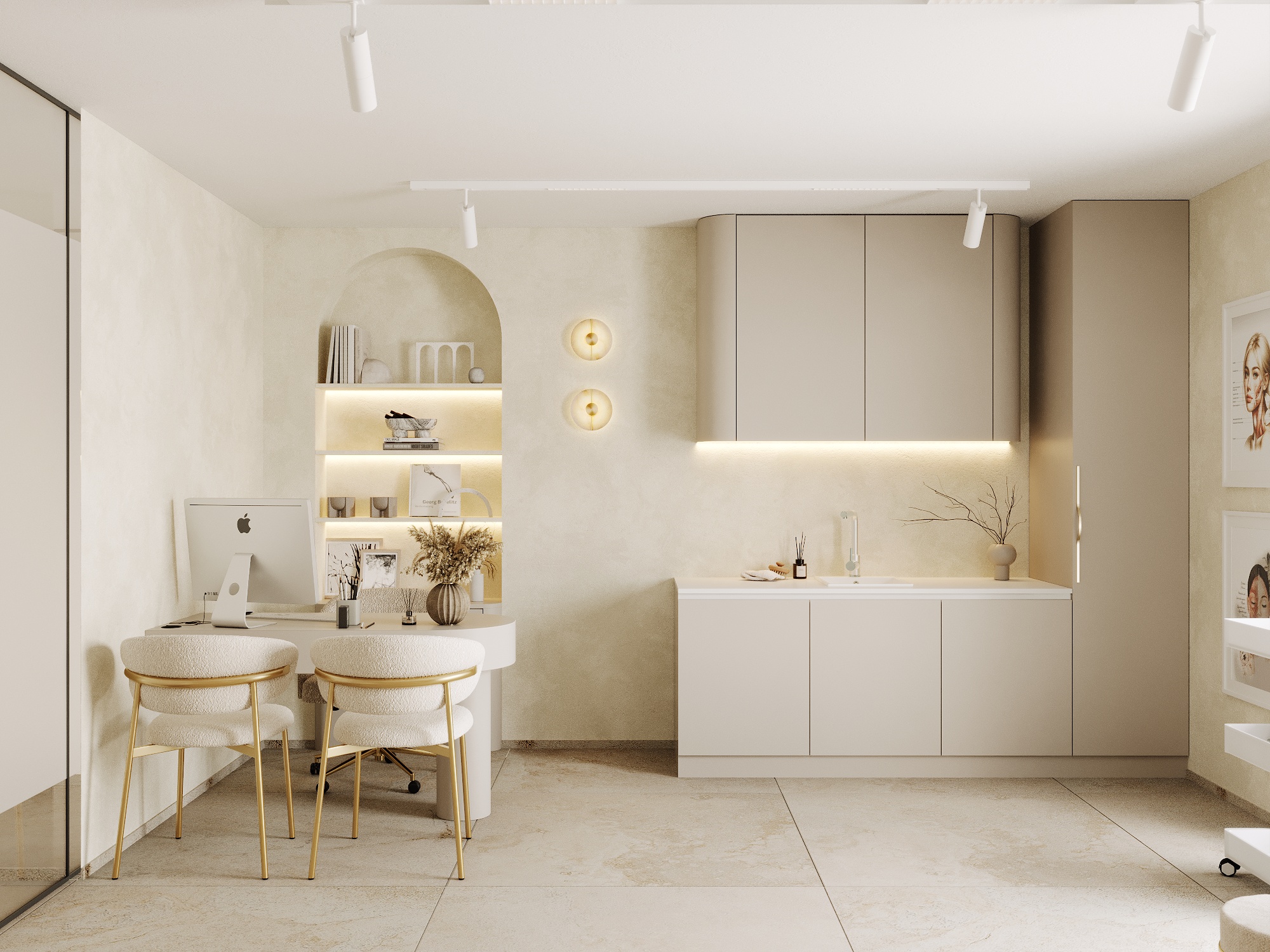 W salonie urody dominuje styl japandi połączony z nowoczesną elegancją, uzupełnioną o złote elementy wykończeniowe. W projekcie występują liczne łuki i zaokrąglenia a dominującą kolorystyką są beże oraz trawertynowe gresy.